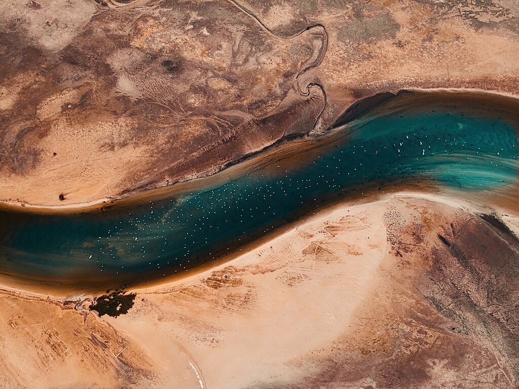 4th place (landscapes): Found just west of photo #3, Ahmad Faihan Almutairi flew their drone to capture this view of Kuwait’s Jahra Nature Reserve. One judge said that this had a “painterly feel,” while another called out the “vibrant blue river water juxtaposed against arid earth tones” that evoked “a sense of serene isolation.” Another photo from Almutairi placed at #3 in the landscapes category.